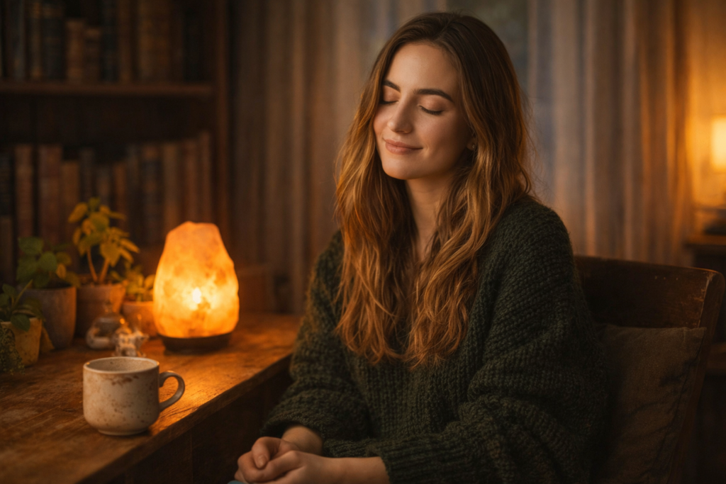 Light is the most underestimated element. Overhead fluorescent light keeps the nervous system mildly alert — it mimics the sun-overhead quality of midday, which your biology reads as “time to be productive and vigilant.” Warm amber light, by contrast, signals evening. Safety. The body relaxes without being asked. A Himalayan salt lamp isn’t wellness theater. It’s a low-cost way to shift the physiological register of a room.